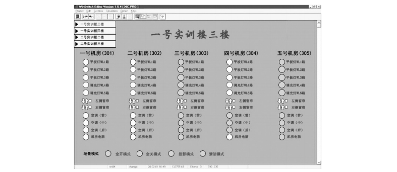 系統采用WinSwitch監控軟件,實現對機房元件的實時管理和遠程操控。WinSwitch采用標準的圖形圖像界面進行操作,可插入樓層、房間、元器件的平面圖,操作簡單直觀。 圖4為WinSwitch 的監控界面,界面設置了各組燈光開關、空調開關、窗簾控制開關、機房電腦總開關,可對現場設備實施遠程控制;控制系統面板和執行器的控制狀態可通過KNX總線實時反饋到監控界面,監控界面的控制命令通過總線傳輸到驅動器,執行相應的操作。可通過中控系統檢查設備是否運行正常,判斷總線是否工作正常、執行器是否正常及回路斷路器是否處于打開的狀態,如出現故障,能夠有效判斷故障原因。