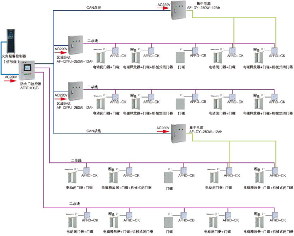 AFRD100防火門監(jiān)控系統(tǒng)采用AFRD100/B防火門監(jiān)控器(主機)+區(qū)域分機+防火門監(jiān)控模塊三層結(jié)構(gòu)組網(wǎng)模式,適用范圍廣,滿足各種環(huán)境現(xiàn)場,便于區(qū)域化管理,監(jiān)控模塊與監(jiān)控器之間采用二總線通訊,監(jiān)控器與分機之間采用CAN總線通訊,滿足了通訊實時性高的要求。