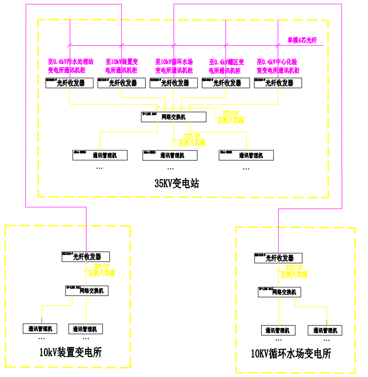 本工程為山東凱瑞英材料科技有限公司羥脲磺胺類醫藥中間體產業鏈項目,本工程系統包含3個變電站(所)分別為35/10kV變電站、10kV裝置變電所和10kV循環水廠變電所。三個變電所均配置有后臺監控系統,35/10kV變電站中放置三套后臺電腦,兩個10kV變電所各配置一套后臺系統。除10kV部分保護數據外,變電所下的0.4kV進線保護和母聯保護,馬達保護裝置數據均上傳接入10kV變電所后臺系統。最終兩個10kV變電所數據通過光纖上傳到35/10kV變電站后臺,進行集中監控。35/10kV變電站集控系統同時預留了中心化驗室變電所,辦公樓變電所,污水處理站變電所,罐區變電所的數據接口。集控系統要求配備了智能設備接口,充分保證系統的安全可靠運行,也要求兼顧目前綜合自動化系統的全面性、先進性。
