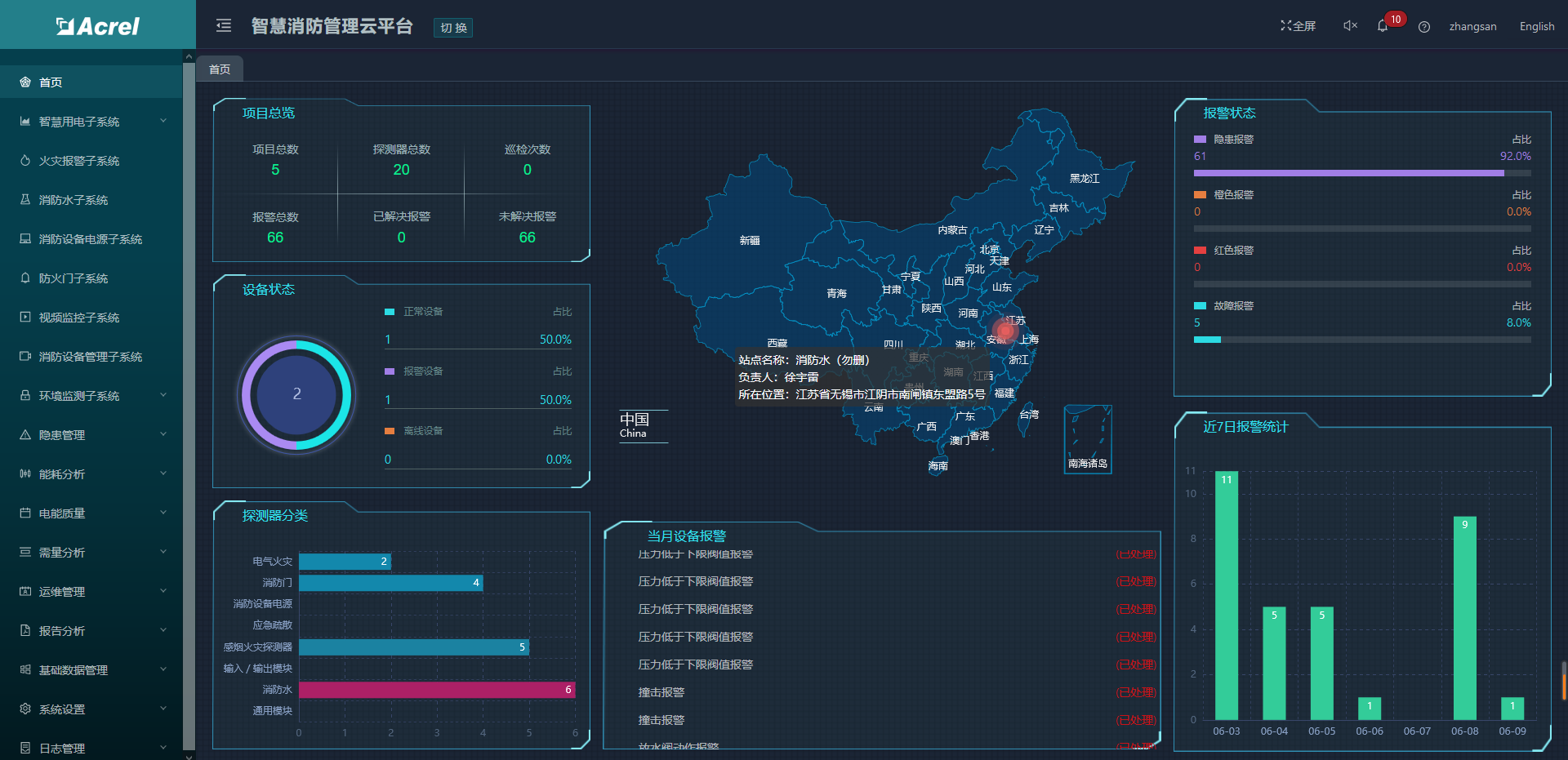 用戶登錄成功之后進入主頁,如圖所示。主要展示的內容有:項目概況、設備狀態、設備分類、設備報警信息、報警分類、報警統計、設備臺賬信息等。其中百度地圖可以選配成BIM建筑模型,任何傳感器報警時可以在BIM模型中預警顯示。