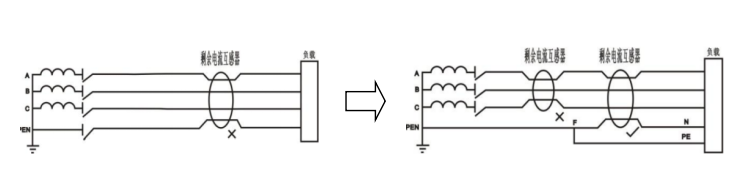 對于TN-C系統(tǒng),不能采用剩余電流繼電器。因?yàn)?PE 線和 N 線合一,若 PEN 線不重復(fù)接地,當(dāng)外殼帶電,互感器進(jìn)出電流相等,ASJ拒動;若PEN線重復(fù)接地,部分單相電流將流入重復(fù)接地,達(dá)一定值后,ASJ 誤動。 需將TN-C系統(tǒng)改造成TN-C-S系統(tǒng),同TN-S系統(tǒng),再將剩余電流互感器接入TN-S系統(tǒng)中。