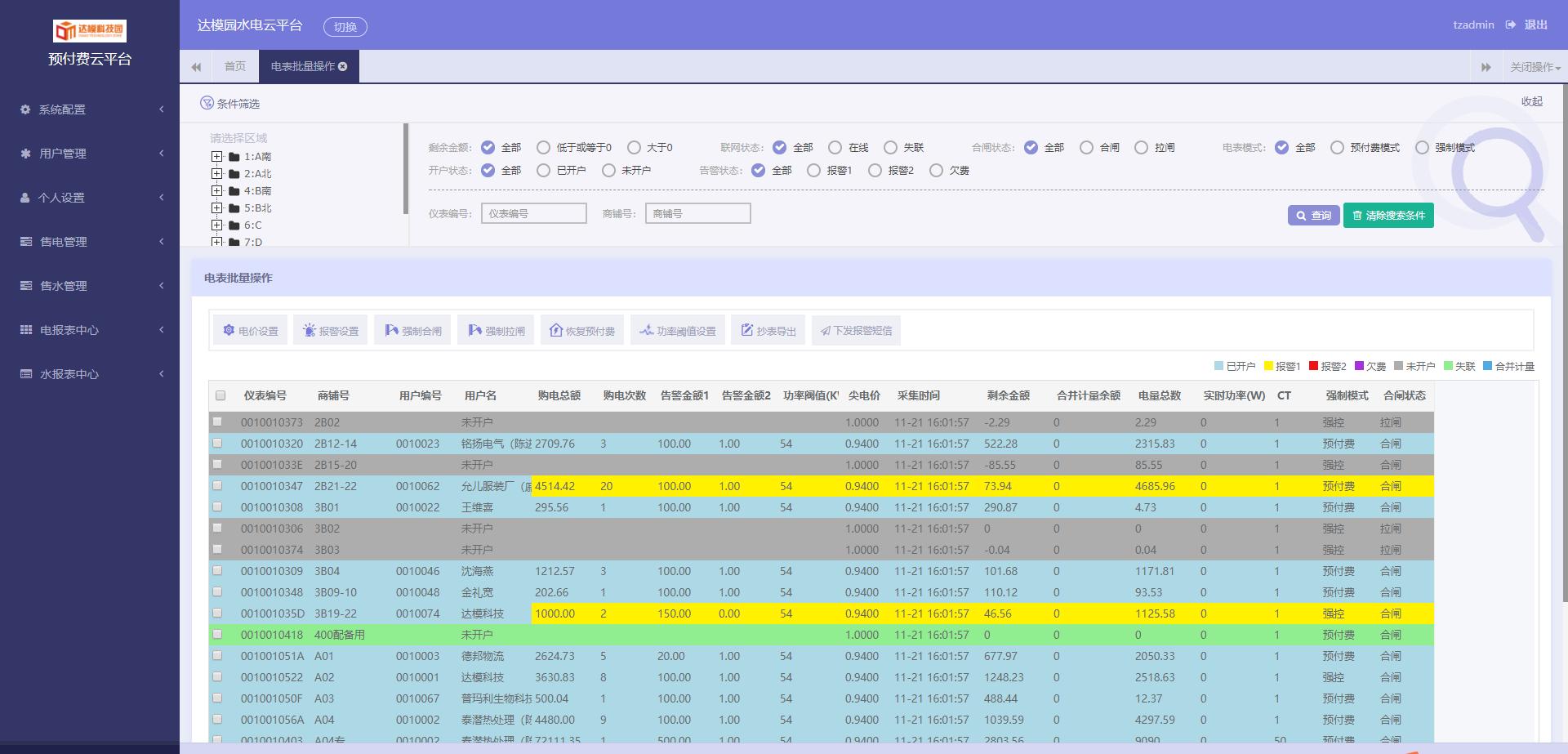 系統(tǒng)針對商鋪開戶不僅支持一戶一表,也支持一戶掛多表的需要;同時支持和解決了項目改造后新老表切換時,老表金額轉(zhuǎn)入的問題;支持峰谷電價,支持一表一電價;可對單表設(shè)置功率過載的閾值,也支持設(shè)置單表金額報警的兩級閾值。