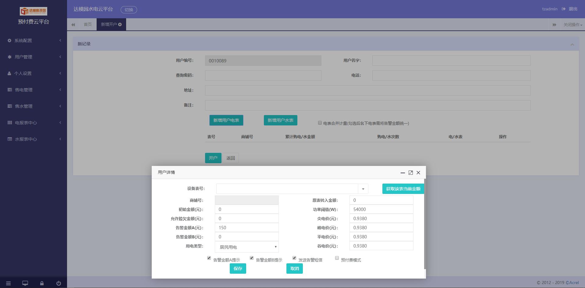 用戶通過網(wǎng)頁進行登錄,系統(tǒng)管理員可以分配各子賬戶及相應權(quán)限。查看系統(tǒng)日志等功能;系統(tǒng)設(shè)置:對建筑、通訊管理機、儀表及默認參數(shù)進行配置;用戶管理:對商鋪用戶執(zhí)行開戶、銷戶、遠程分合閘、抄表導出及記錄查詢等操作;售電管理:對已開戶的表進行遠程售電、退電、沖正及記錄查詢等操作;報表中心:提供售電財務(wù)報表、用能報表、報警報表等查詢。