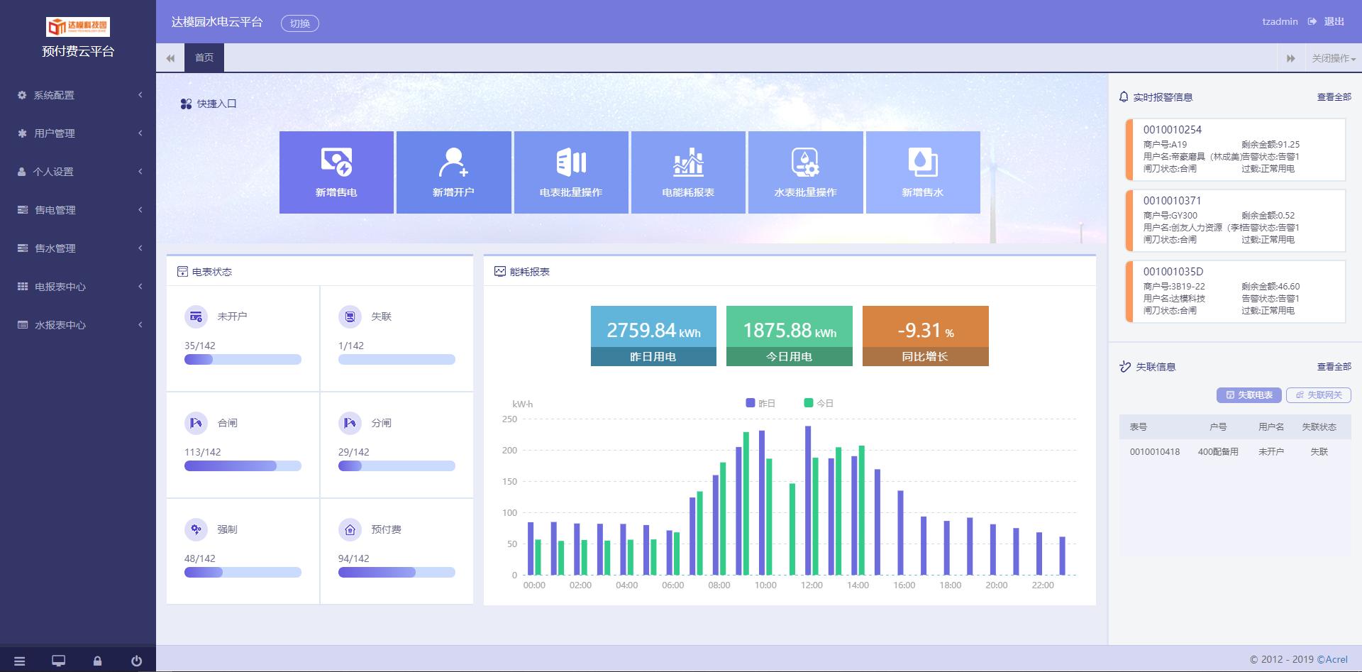 系統(tǒng)登錄首頁,首頁提供新增售電售水、新增開戶、銷戶等快捷入口,實時顯示所有儀表的在線狀態(tài),以柱狀圖的形式展示整個項目的能耗柱狀圖等功能。