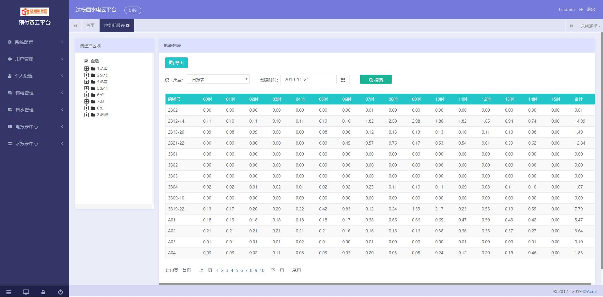 系統(tǒng)還提供了多個報表以供查詢,分別是日/月/年財務(wù)銷售統(tǒng)計報表、失聯(lián)表/通訊管理機查詢報表、開戶充值查詢報表、能耗查詢報表、實時報警/歷史報警查詢報表,支持導出。以下是財務(wù)報表和預付費表日用能查詢報表: