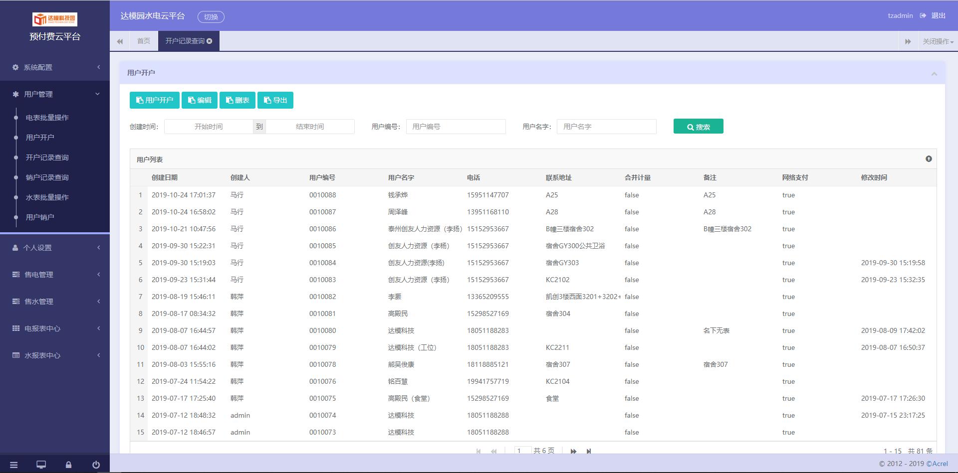 3)用戶管理:對商鋪用戶執(zhí)行開戶、銷戶、遠程分合閘、批量操作及記錄查詢等操作;