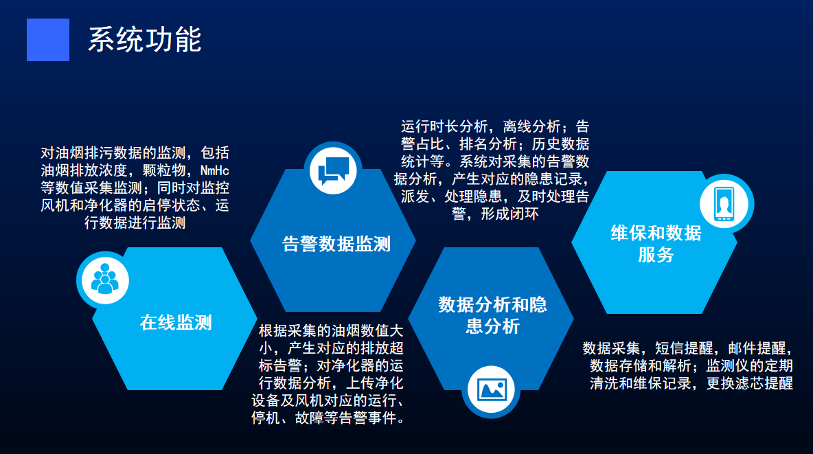 | 監(jiān)測因子 | 監(jiān)測因子 | 可實時監(jiān)測油煙濃度、顆粒物濃度、非甲烷總烴濃度、傳感器連接狀態(tài)、風機及凈化器的電流及工作狀態(tài) |