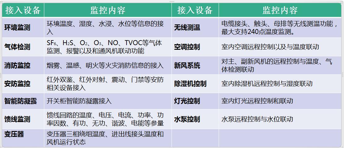 配電室綜合監控設備安裝在配電室、箱變、變電所內,通過采集和傳輸技術,可以實時監測配電室內的重要場所和設備的工作環境,如溫度、濕度、電纜溝水位、漏水/水浸、有害氣體(SF6,H2S,NO,CO,O2,O3)、TVOC、煙霧、明火、人體感應、噪聲等。