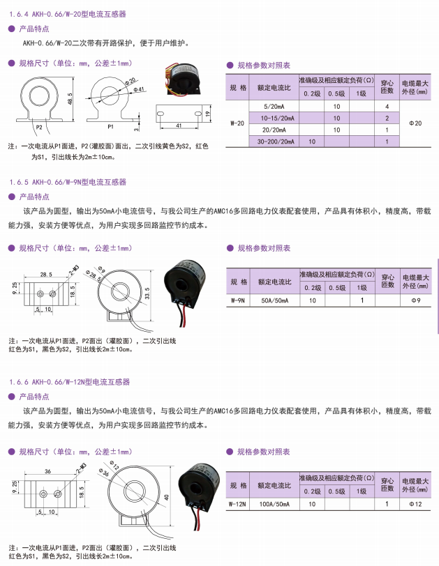 AKH-0.66 W系列電流互感器輸出為5-20mA等小電流信號,與我公司生產的AMC16多回路電力儀表配套使用,產品具有體積小,精度高,帶載能力強,安裝方便等優點,為用戶實現多回路監控節約成本,有圓型和方型供用戶根據需要選用。