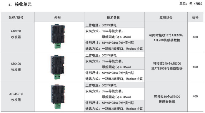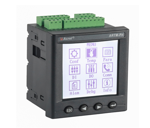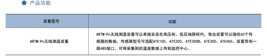 ARTM-Pn無線測溫裝置:ARTM-Pn無線測溫裝置可以單獨安裝在高壓柜、低壓抽屜柜內(nèi),每臺裝置可以接收18個傳感器的數(shù)據(jù),傳感器型號可選配ATE100、ATE200、ATE300。裝置帶有一路485接口,可將采集到的溫度數(shù)據(jù)上傳到監(jiān)控中心。