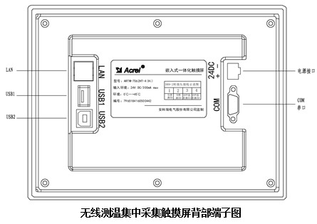 無線測溫集中采集觸摸屏:無線測溫觸摸屏可以嵌入式安裝在高壓柜、低壓抽屜柜內(nèi),每臺裝置可以接收240個傳感器的數(shù)據(jù),可與ATE100、ATE200、ATE300三種傳感器選配使用。裝置帶有一路485接口、可選配一路以太網(wǎng)口,可將采集到的溫度數(shù)據(jù)上傳到監(jiān)控中心。
