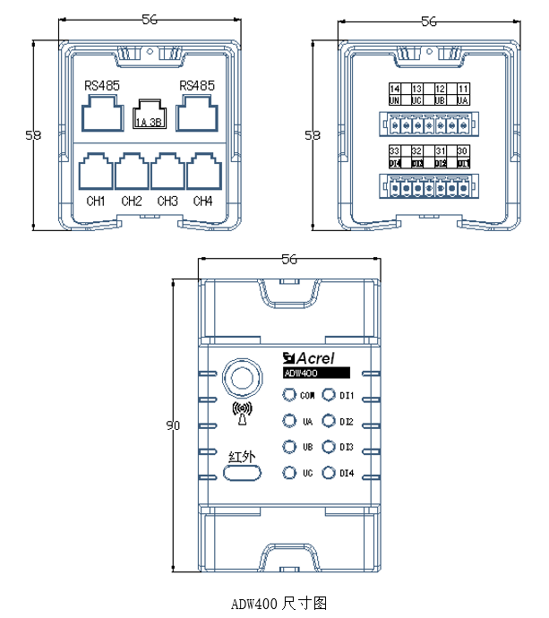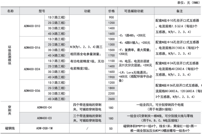 ADW400環(huán)保監(jiān)測模塊主要用于計量低壓網(wǎng)絡的三相有功電能,同時可選擇四個回路的電流輸入,具有RS485通訊和470MHz無線通訊功能,方便用戶進行用電監(jiān)測、集抄和管理。可靈活安裝于配電箱內,實現(xiàn)對不同區(qū)域和不同負荷的分項電能計量,統(tǒng)計和分析。