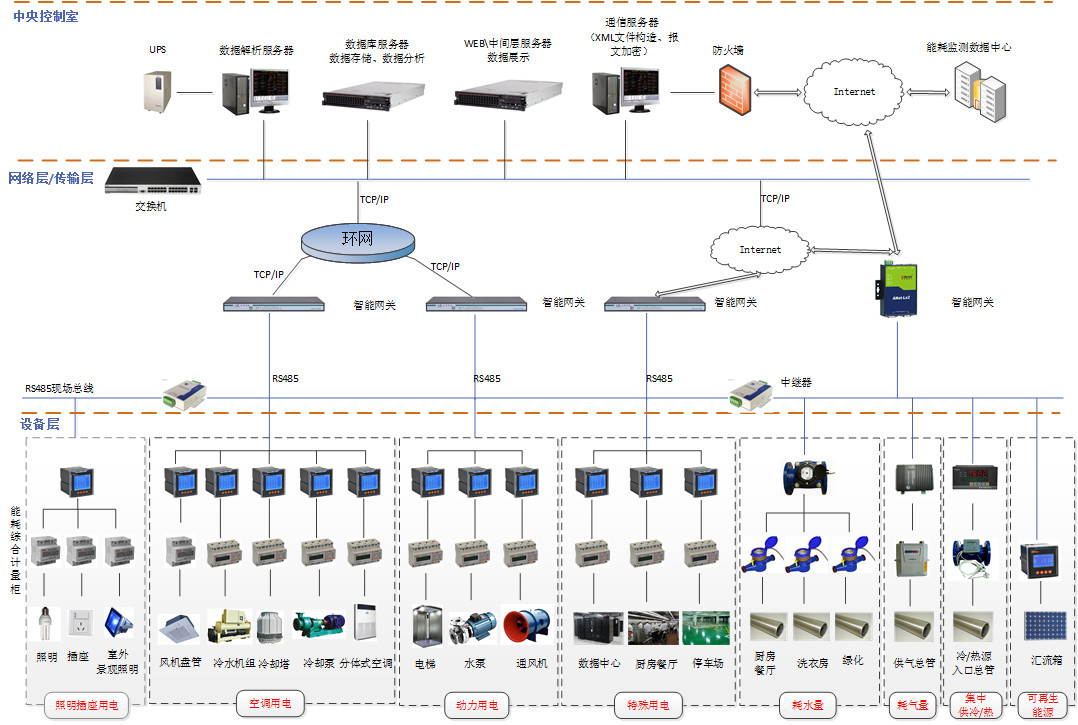 Acrel-5000建筑能耗分析管理系統以計算機、通訊設備、測控單元為基本工具,根據現場實際情況采用現場總線、光纖環網或無線通訊中的一種或多種結合的組網方式,為大型公共建筑的實時數據采集及遠程管理與控制提供了基礎平臺,它可以和檢測設備構成任意復雜的監控系統。開放性、網絡化、單元化、組態化的采用面向對象的分層、分級、分布式智能一體化結構。建立如下層次結構: