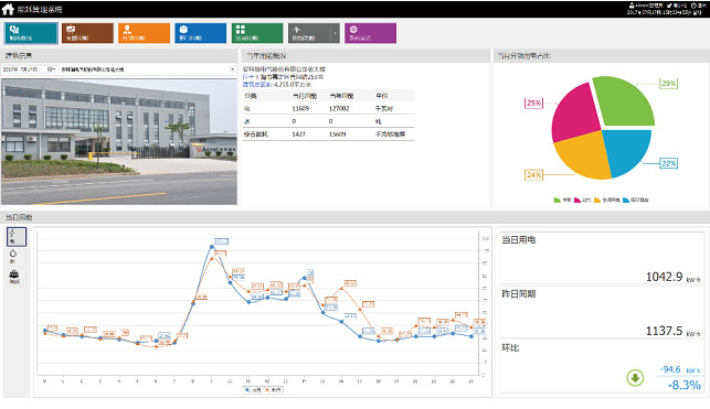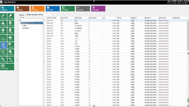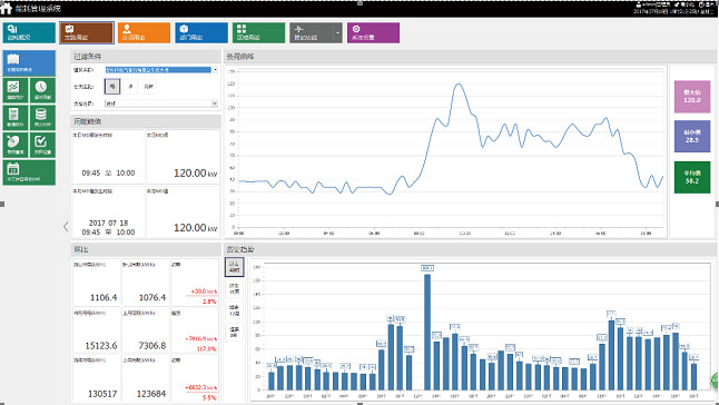 系統可以根據分類能耗的支路名稱查詢用能情況,顯示當日和當月的用能峰值(電能對應最大需量值)。顯示當日用能、當月用能、當年用能與昨日同期用能、上月同期用能、上年同期用能的比較情況。以條形顯示過去48小時、31天、12個月、3年的能耗情況。右上角顯示過去15分鐘曲線(電表顯示功率曲線,流量表顯示流速曲線),同時顯示當前值與15分鐘內的最大值和最小值。
