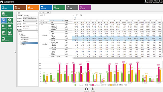 系統依據住建部分類分項能耗數據采集導則,將建筑物耗電分為照明插座、空調、動力和特殊用電進行計量裝置選型和設置,并按用能區域或功能區域等劃分并進行統計,以報表和同、環比棒圖形式展現該區域的能源消耗。