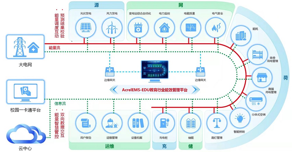 通過在源、網、荷、儲、充的各個關鍵節點安裝監測、分析、保護、治理裝置, 通過高性能邊緣計算網關采集數據并上傳至企業微網平臺。平臺根據新的電網價格、 用電負荷、電網調度指令等情況,調整各系統控制策略并遠程下發,使企業微電網始終高效穩定運行, 降低企業用電成本,實現能源互聯、信息互動。