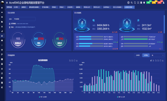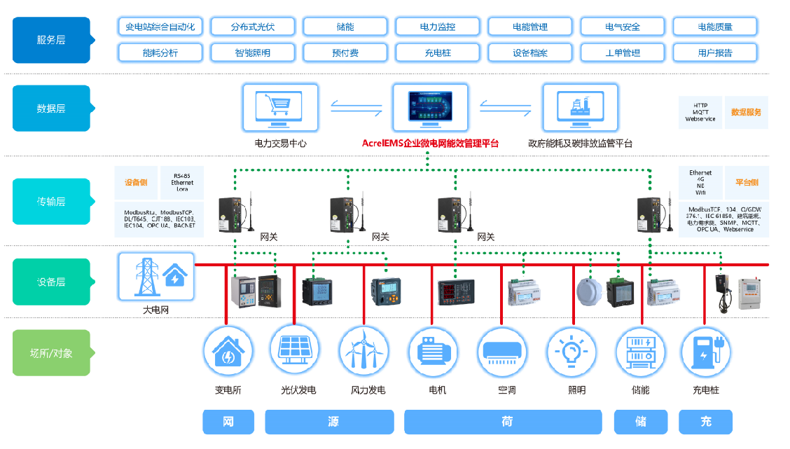 在企業微電網源、網、荷、儲、充的各個關鍵節點安裝計量和分析裝置,搭建三級計量體系,用于監測企業能耗總量和能耗強度,從而診斷低能效環節。平臺根據最新的電網價格、用電負荷、電網調度指令等情況,調整能源使用策略,優先使用綠色能源,使企業微電網始終高效穩定運行,快速響應電網需求,實現能源互聯、信息互動,也可以把數據上傳政府能源管控平臺,例如發改委、工信部、住建部門重點用能單位能耗在線監測平臺、電力需求側平臺、建筑能耗監測平臺等。