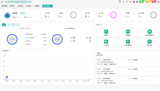為平臺主界面,針對于企業微電網的源、網、荷、儲、充的各個關鍵節點安裝監測、分析、保護、治理裝置, 通過高性能邊緣計算網關采集數據并上傳至企業微網平臺。平臺根據新的電網價格、用電負荷、電網調度指令等情況, 調整各系統控制策略并遠程下發,使企業微電網始終高效穩定運行,降低企業用電成本,實現能源互聯、信息互動。