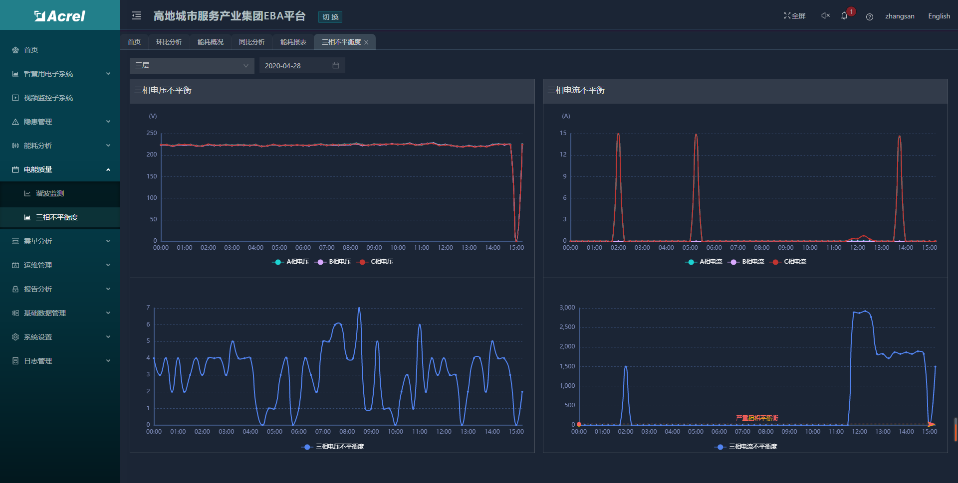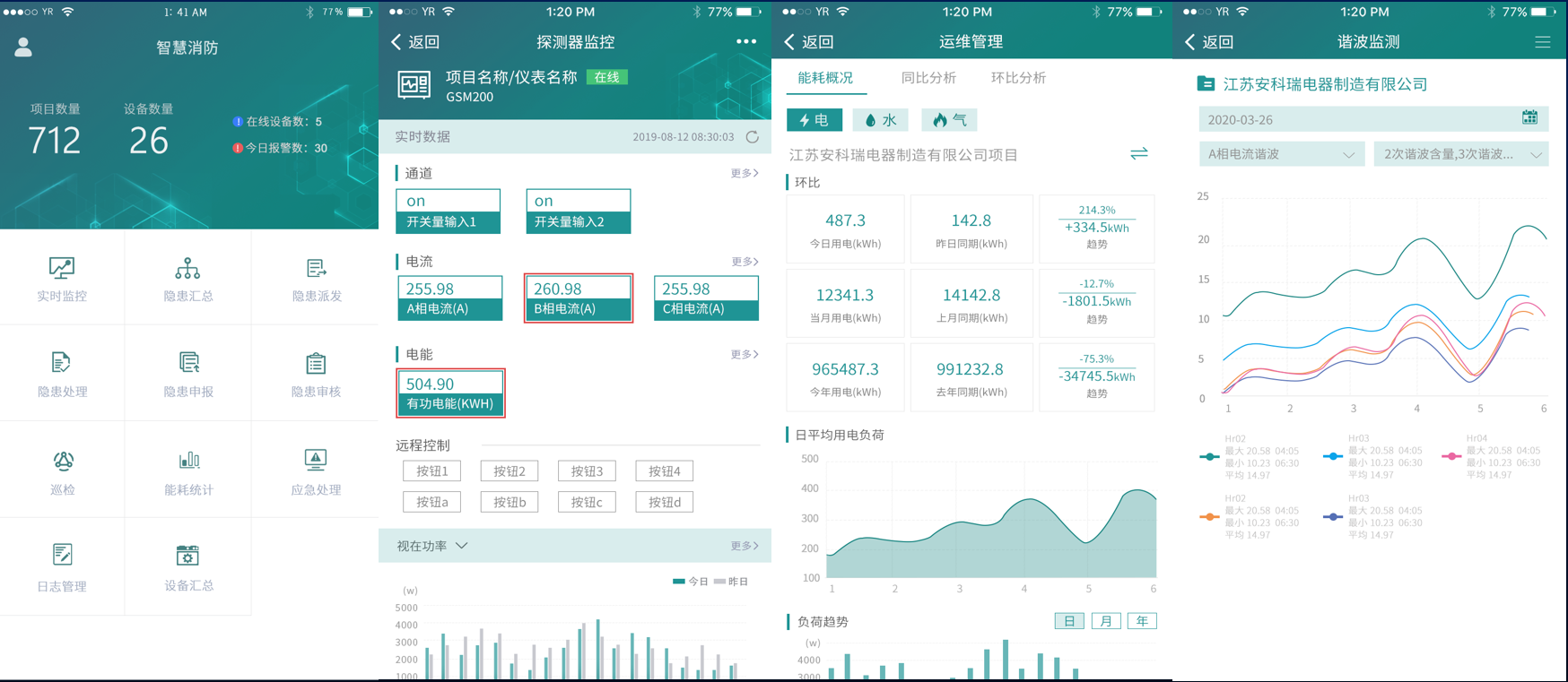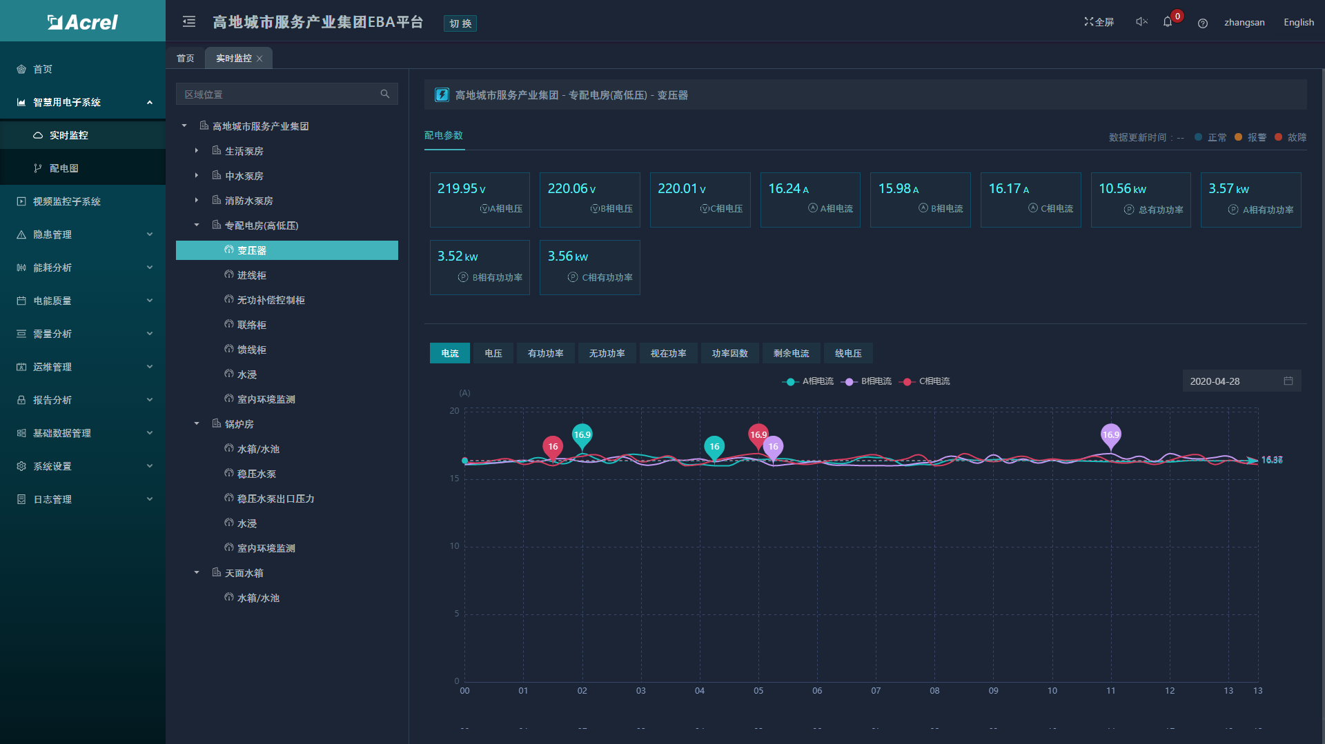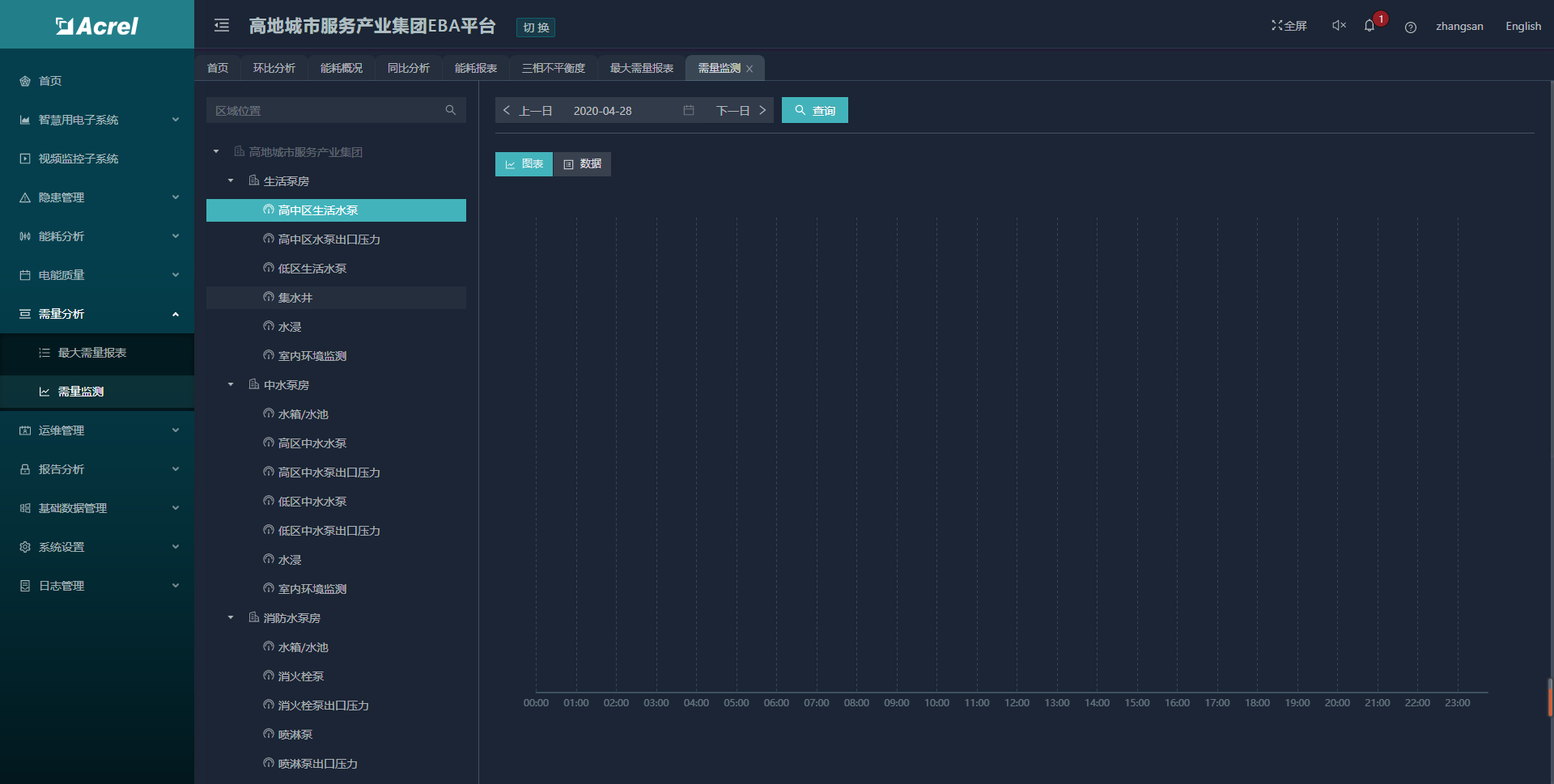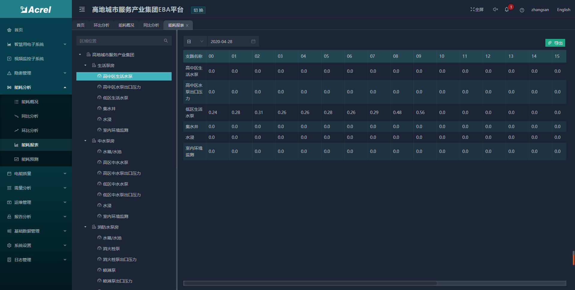 針對智慧用電部分,系統提供能耗分析功能,按回路可查詢日、月、年的能耗報表和曲線。