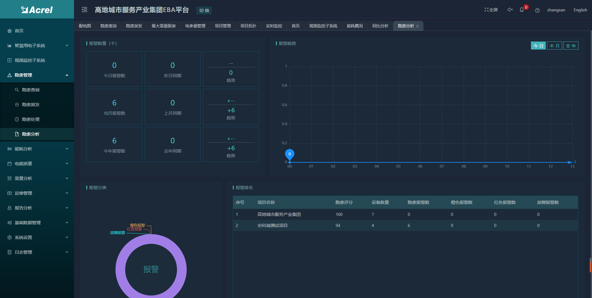 系統在產生報警或隱患后,系統可以針對工程人員派發工單,處理完以后工程人員能夠在系統中填寫相關工單任務記錄,以供歷史查詢。隱患統計支持對項目進行日、月、季、年的維度查詢,并能夠自定義時間查詢,將項目下隱患以曲線,圖表的形式展現。