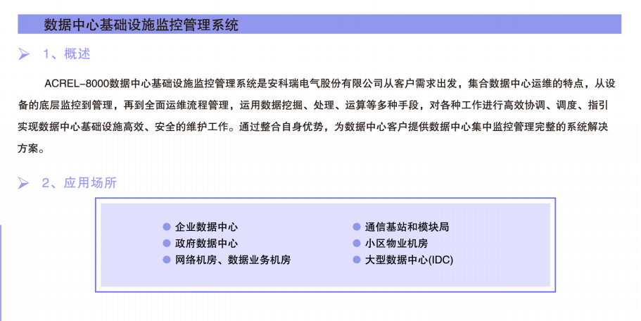 Acrel-8000數(shù)據(jù)中心基礎設施監(jiān)控管理系統(tǒng)是安科瑞電氣股份有限公司從客戶需求出發(fā),集合數(shù)據(jù)中心運營的特點,從設備的底層監(jiān)控到管理,再到全面運營流程管理,運用數(shù)據(jù)挖掘、處理、運算等多種手段,對各種工作進行高效協(xié)調(diào)、調(diào)度、指引實現(xiàn)數(shù)據(jù)中心基礎設施高效、安全的維護工作。通過整合自身優(yōu)勢,為數(shù)據(jù)中心客戶提供數(shù)據(jù)中心集中監(jiān)控管理完整的